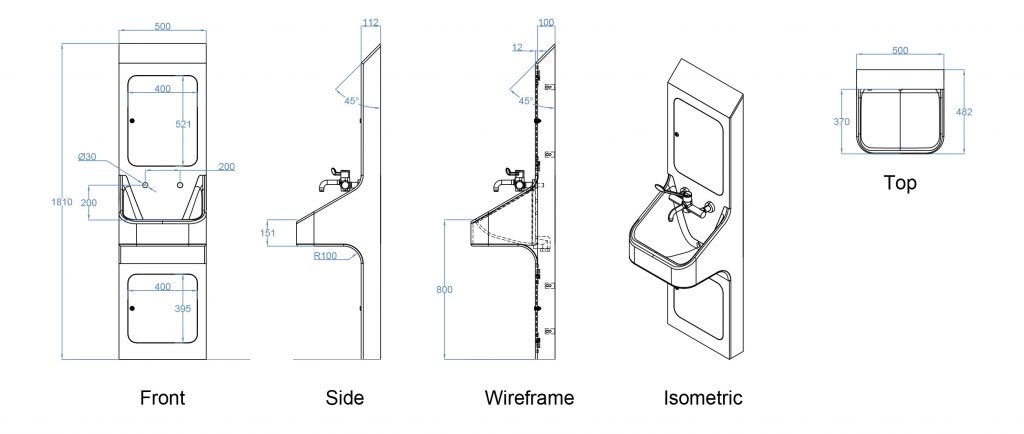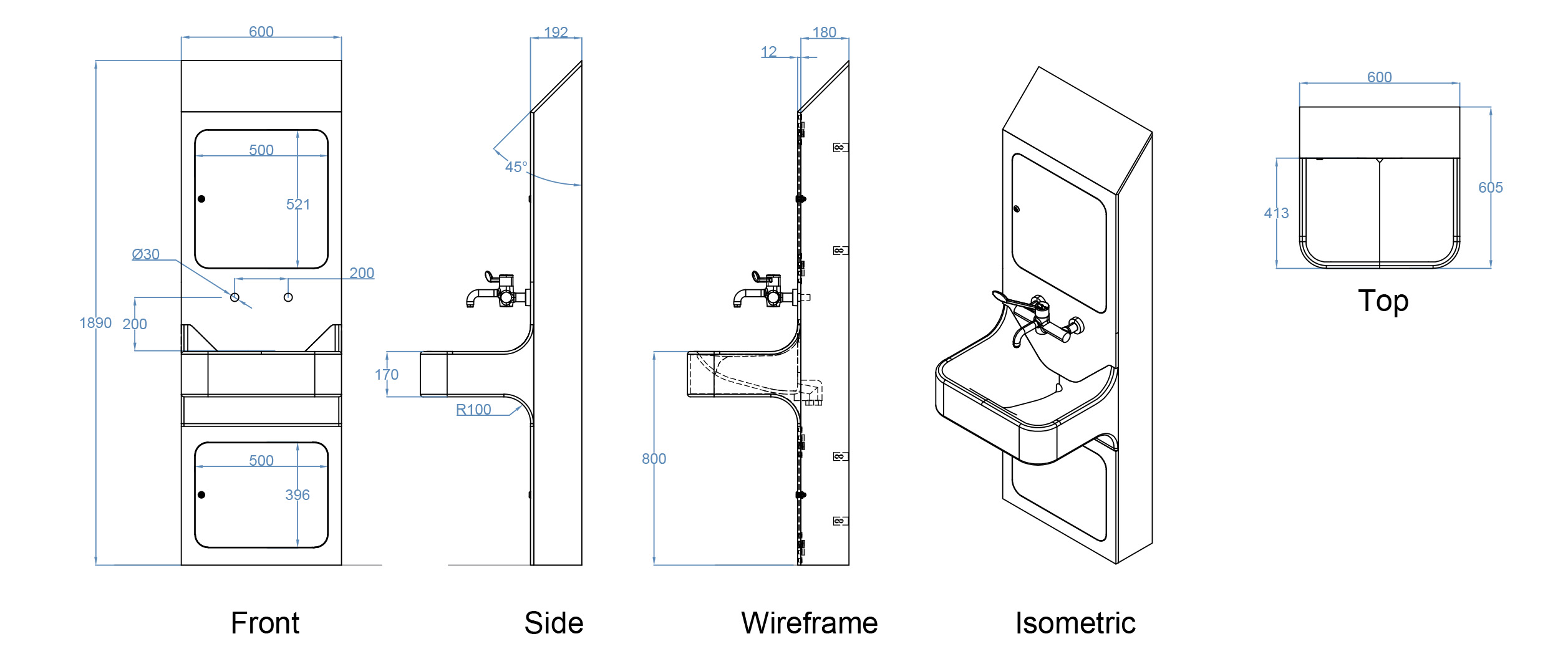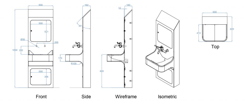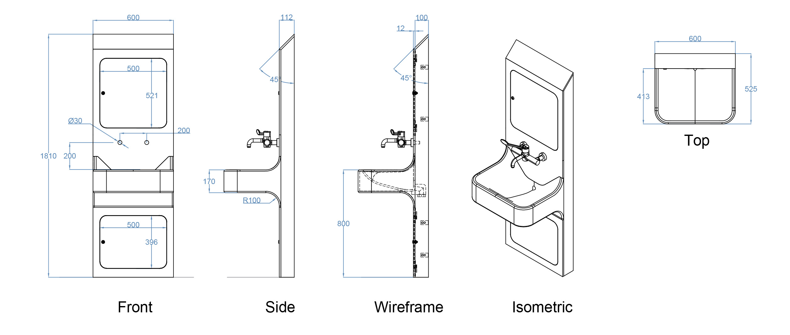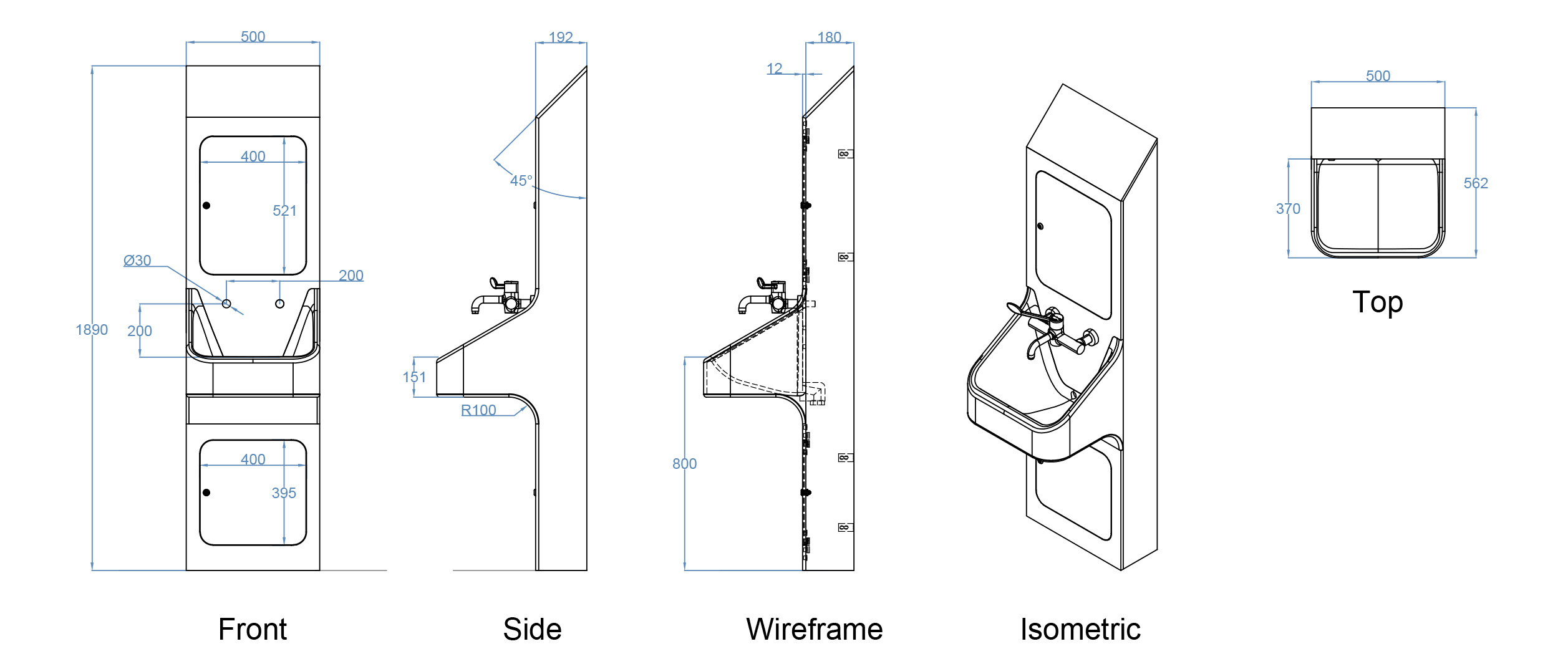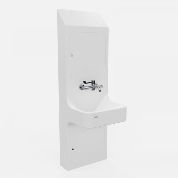 The ONVO Half Height Fixed Cliniwash is an 1800mm high all in one IPS and Clinical basin solution. This is for situations where there is space within the wall void to accommodate the pipework or where the pipework is coming from the floor and up the face of the wall. The 45 Degree angled top means there are no horizontal ledges and makes it easily wipeable. Access to pipework/services is through two pivot hinged flush access doors above & below the basin.