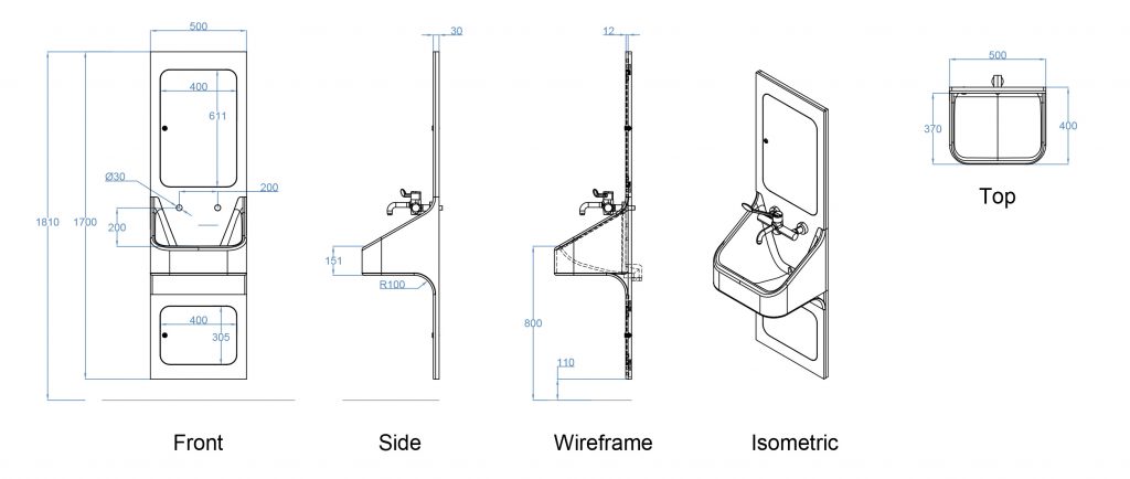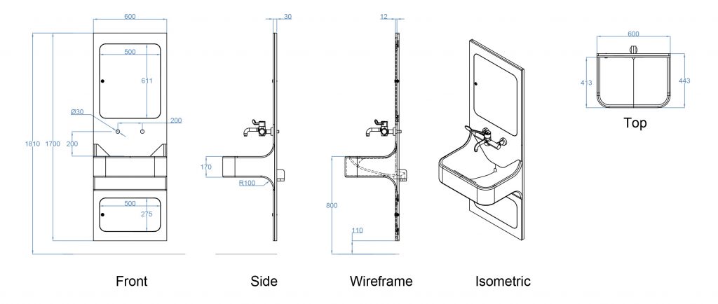 The ONVO Recessed Cliniwash is a fully recessed all in one IPS and Clinical basin solution. This is for situations where there is a wall void of minimum 100mm to accommodate the pipework, waste pipe and steel support frame for the unit. Projecting less than 450mm in total from the finished wall this product is ideal for rooms where space is limited. Access to pipework/services is through two pivot hinged flush access doors above & below the basin.